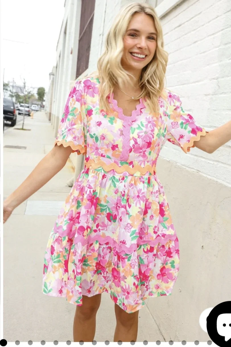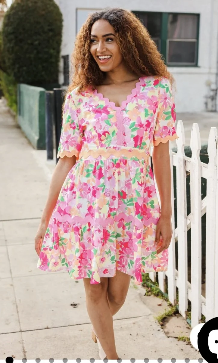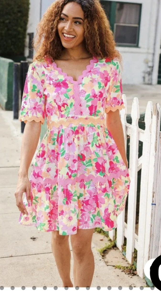 Shop › Beautiful You Rose Floral Ric Rak Image 1 of 4 Image 2 of 4 Image 3 of 4 Image 4 of 4 Beautiful You Rose Floral Ric Rak $42.00 Look more lovely in this stunning floral print baby doll dress that features ric rac details in contrasting pink and coral. Size: Small Medium Add To Cart Added! Look more lovely in this stunning floral print baby doll dress that features ric rac details in contrasting pink and coral.
